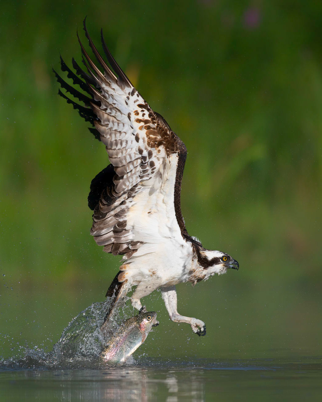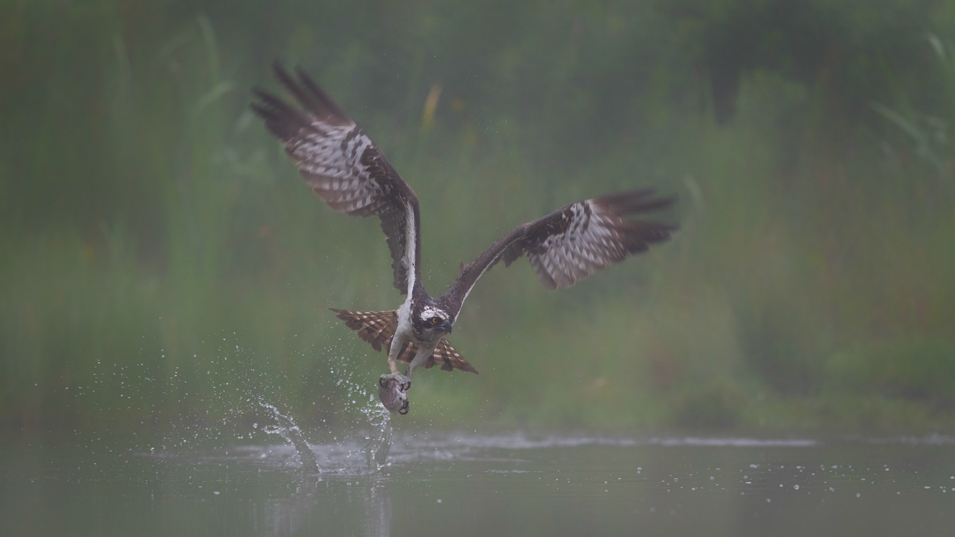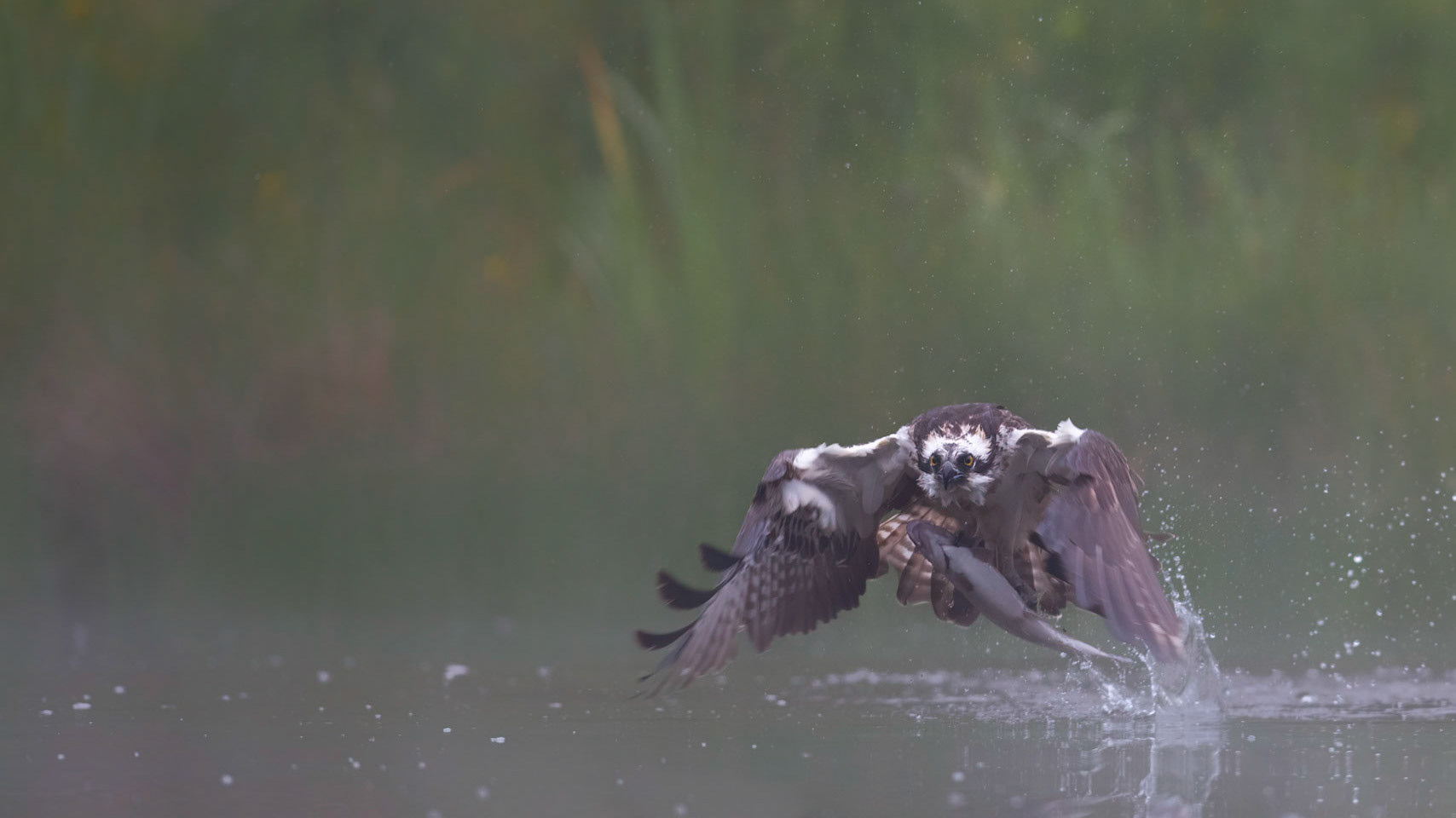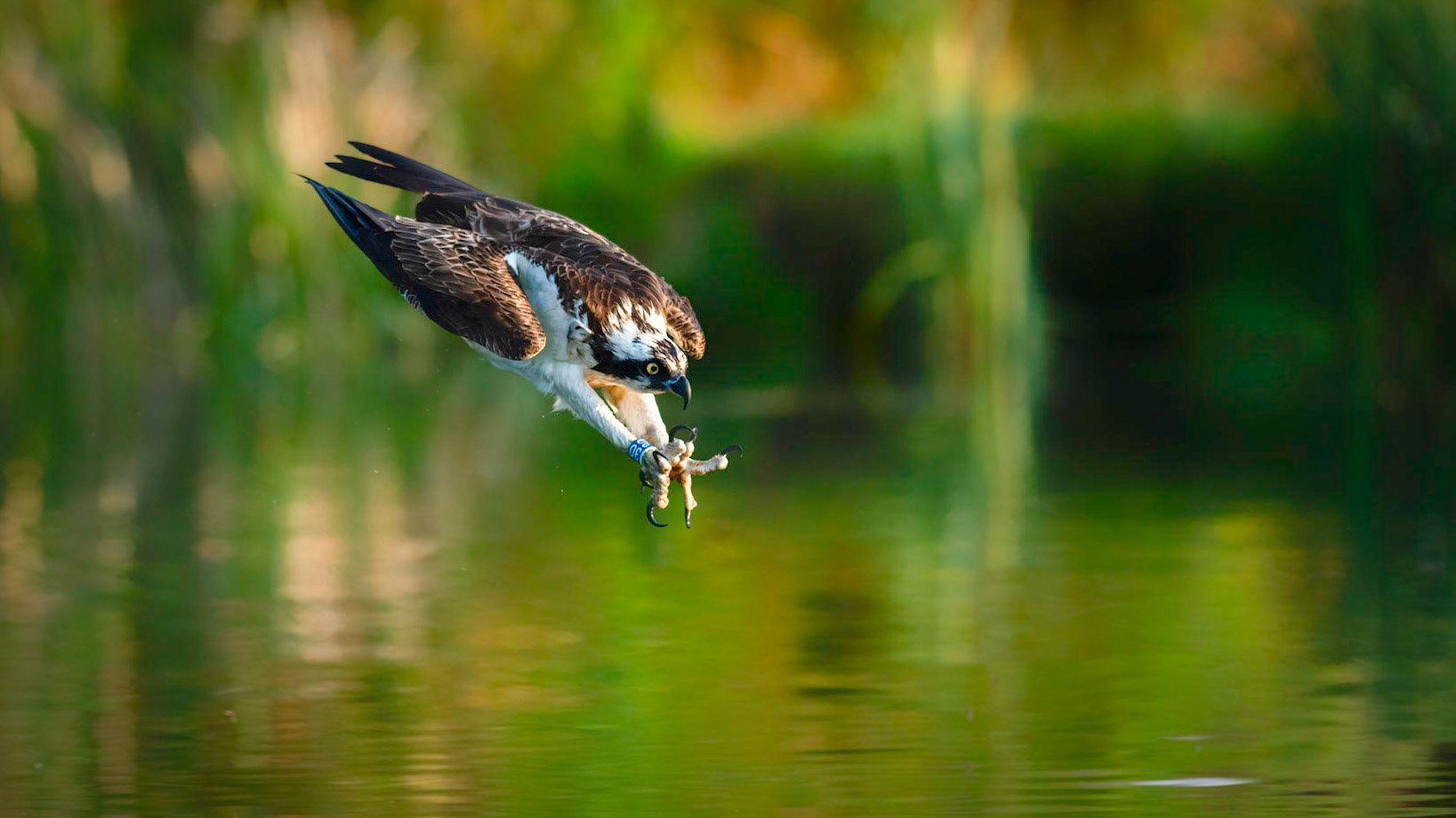 'A large fish-eating bird of prey with long, narrow wings and a white underside and crown, found throughout the world'